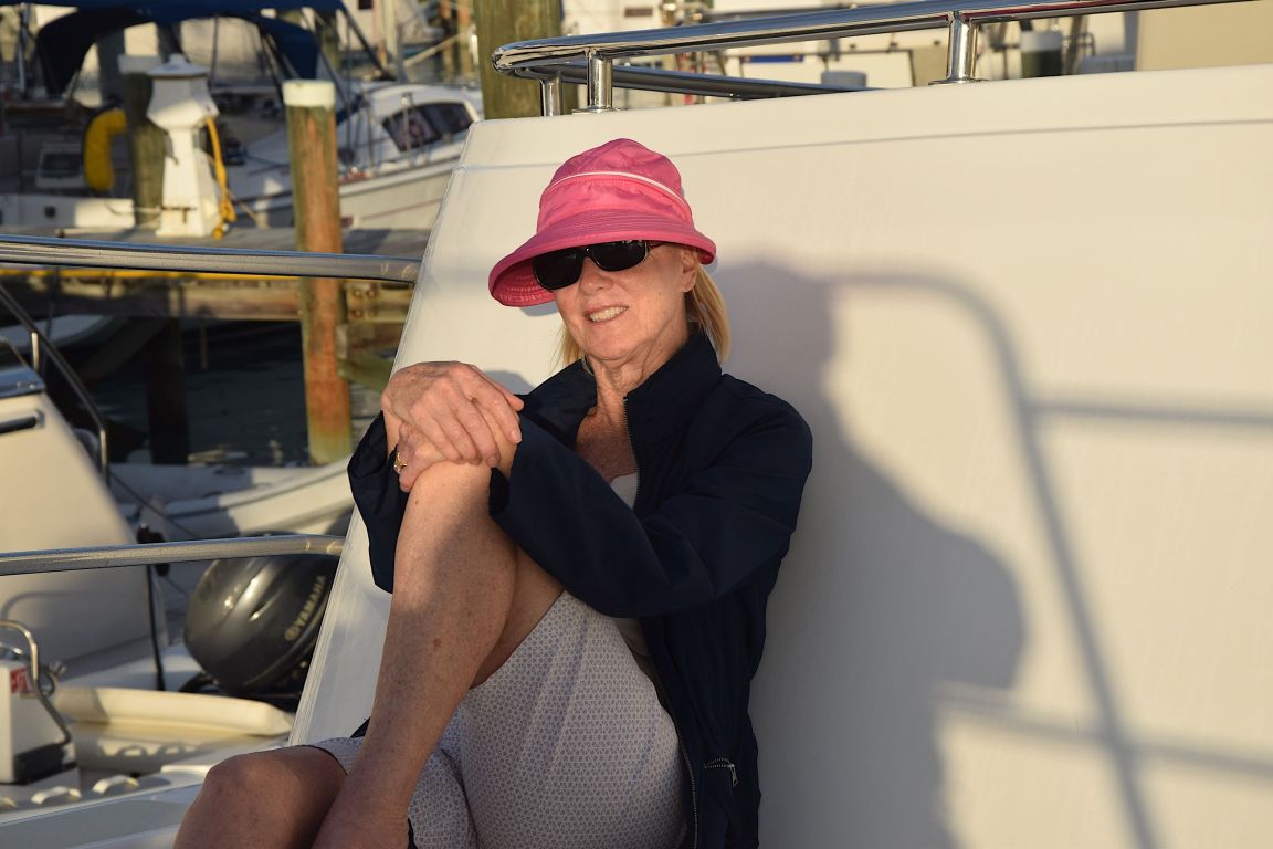 Claudia sitting at Pete's Pub in Little Harbor, our boat is moored behind her.